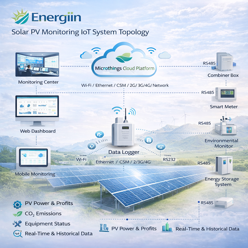 Energiin adalah sistem remote monitoring untuk pembangkit listrik tenaga surya PV (Photovoltaic) yang memungkinkan pemantauan data operasional secara real-time, aman, dan terintegrasi melalui platform Microthings Cloud Server.