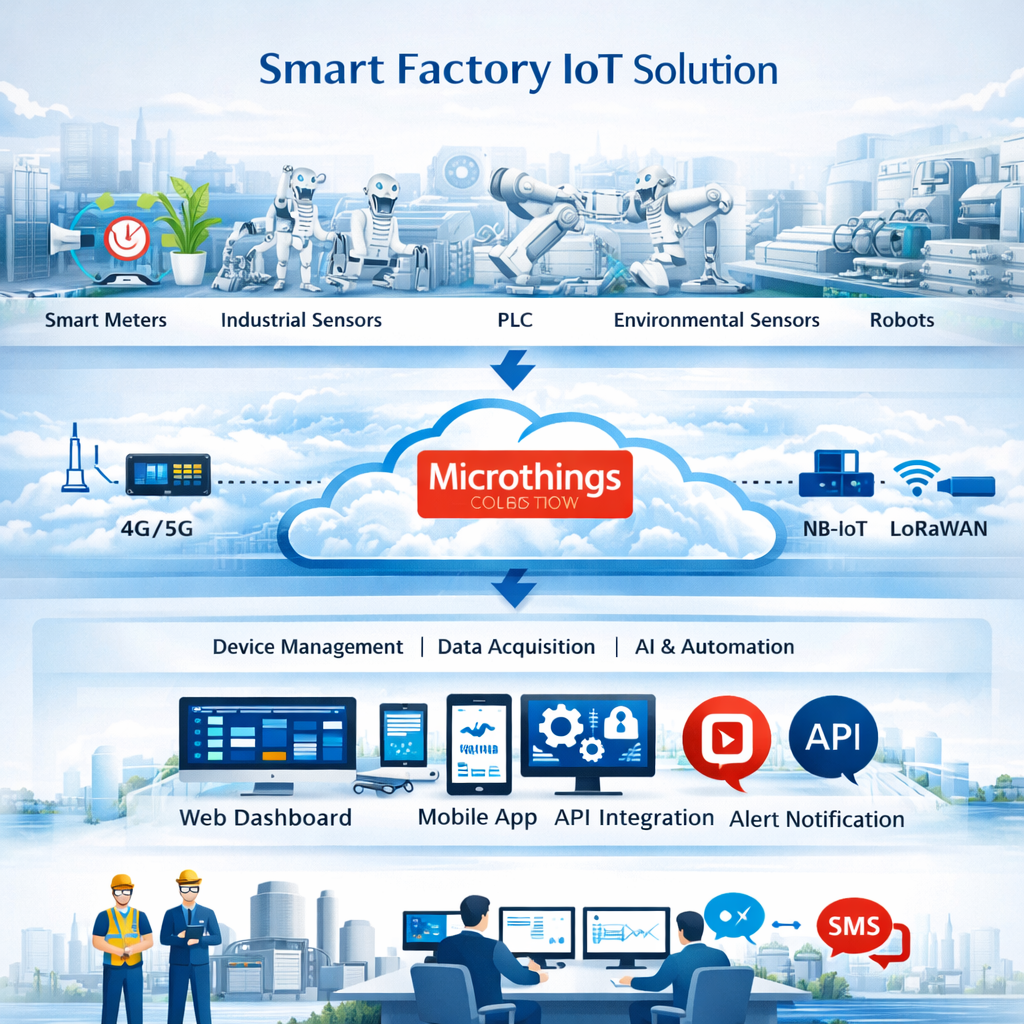 Microthings menghadirkan platform Sensor to Cloud yang mengintegrasikan sensor, perangkat industri, jaringan komunikasi, dan cloud computing dalam satu ekosistem Internet of Things (IoT) yang terintegrasi.