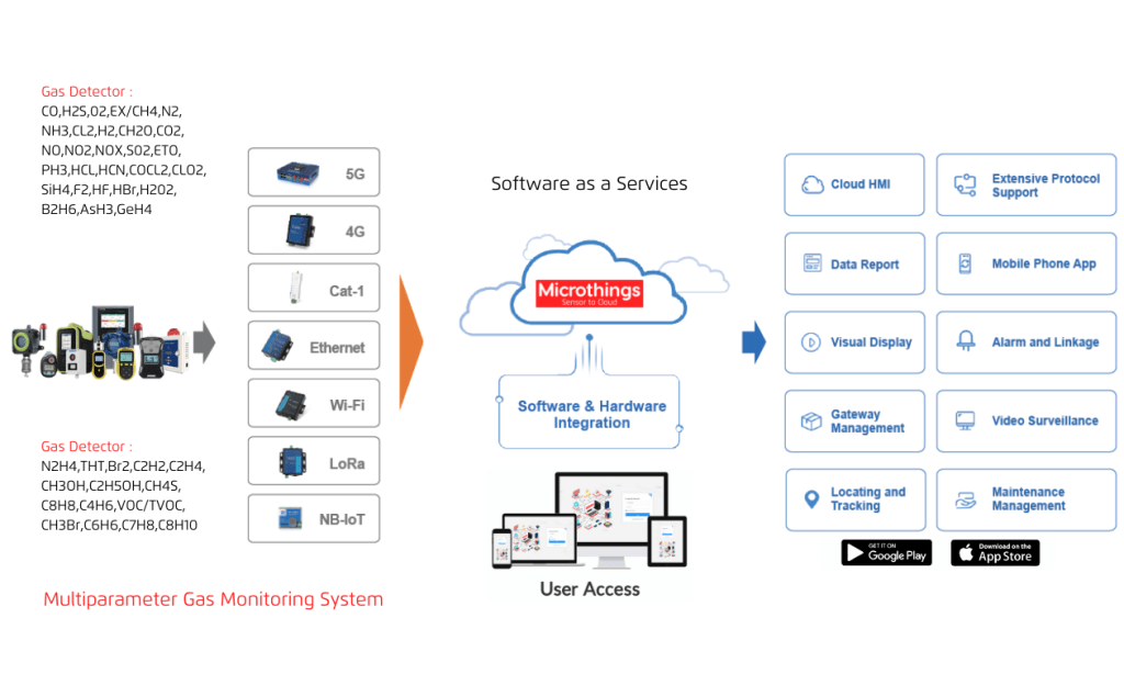 Multiparameter Gas Monitoring System adalah Sistem yang dapat Mengumpulkan Data di tempat dan mengirimkan Data Pemantauan ke Platform Cloud Microthings melalui Jaringan Nirkabel/4G atau Kabel. Detektor Gas tetap didistribusikan di area tertentu untuk membentuk jaringan pemantauan yang efektif, dan data ditampilkan ke pihak manajemen melalui Platform Cloud Microthings, yang memudahkan pihak manajemen untuk membuat keputusan dengan cepat. Platform ini juga memiliki berbagai fungsi seperti Pemrosesan Data Alarm, Perekaman, Kueri, Statistik, dan Keluaran Laporan. Dengan demikian, mengandalkan pengendalian polusi, operasi dan pemeliharaan untuk memberikan jaminan mekanisme manajemen jangka panjang, sehingga mencapai pengawasan pemeliharaan yang efisien dan nyaman.